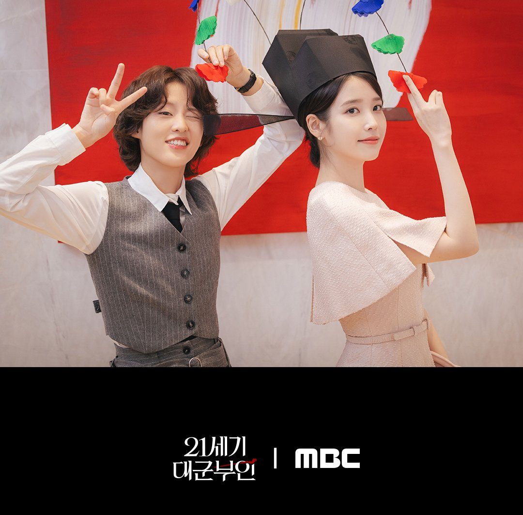 The newly released behind-the-scenes photos showcase the cast’s strong bond and playful chemistry on set. The photos feature affectionate moments between IU and Byeon Woo Seok. One image shows IU wearing a cute traditional flower headpiece, while another shows Byeon Woo Seok pretending to be a staff member as he plays around with a walkie-talkie.